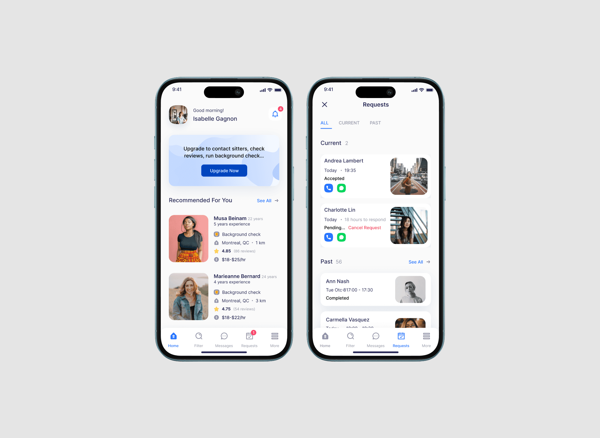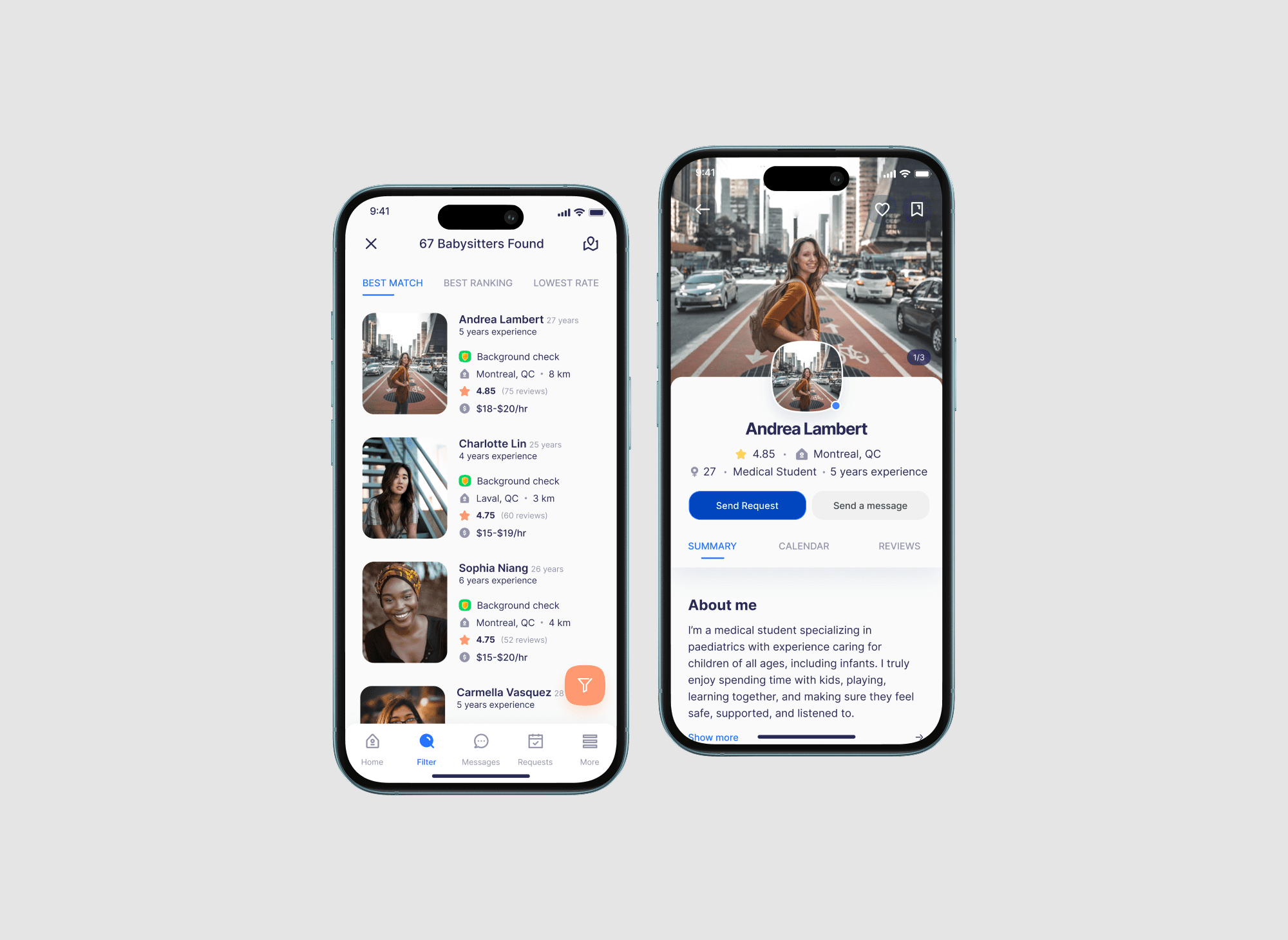 PROJECT TYPE DELIVERABLES Hiring a Babysitter Mobile App Mockups TOOLS DURATION Figma 1 month MY ROLE End-to-end product design Research, Flow, Wireframes, Prototyping. OVERVIEW Finding reliable and trustworthy childcare is a significant hurdle for families. Parents often face safety and trust barriers, time-consuming search to discover vetted babysitters with the right experience in their area when they actually need them. Existing options lack important features like an open channel for discussion of all the details of the hiring conditions upfront. CHALLENGE How might we create a trustworthy platform for parents looking for babysitters that can easily evaluate safety, availability and compatibility? Competitive audit was performed on 3 known platforms for hiring babysitters. All of them lack the feature of structuring responsibilities, expectations and working hours upfront, causing ambiguity and negotiation friction. The major point neglected is the background check, where existing options rather provide marketplace directory where the screening is left on the parents. Primary research identified key user needs: Confidence in sitter credibility and safety, fast discovery based on requirements, clear expectations before booking and frictionless booking and payment. PROBLEM STATEMENT Parents need a fast and trustworthy way to find, evaluate, and book babysitters, because existing platforms make the process slow, unclear, and emotionally stressful.